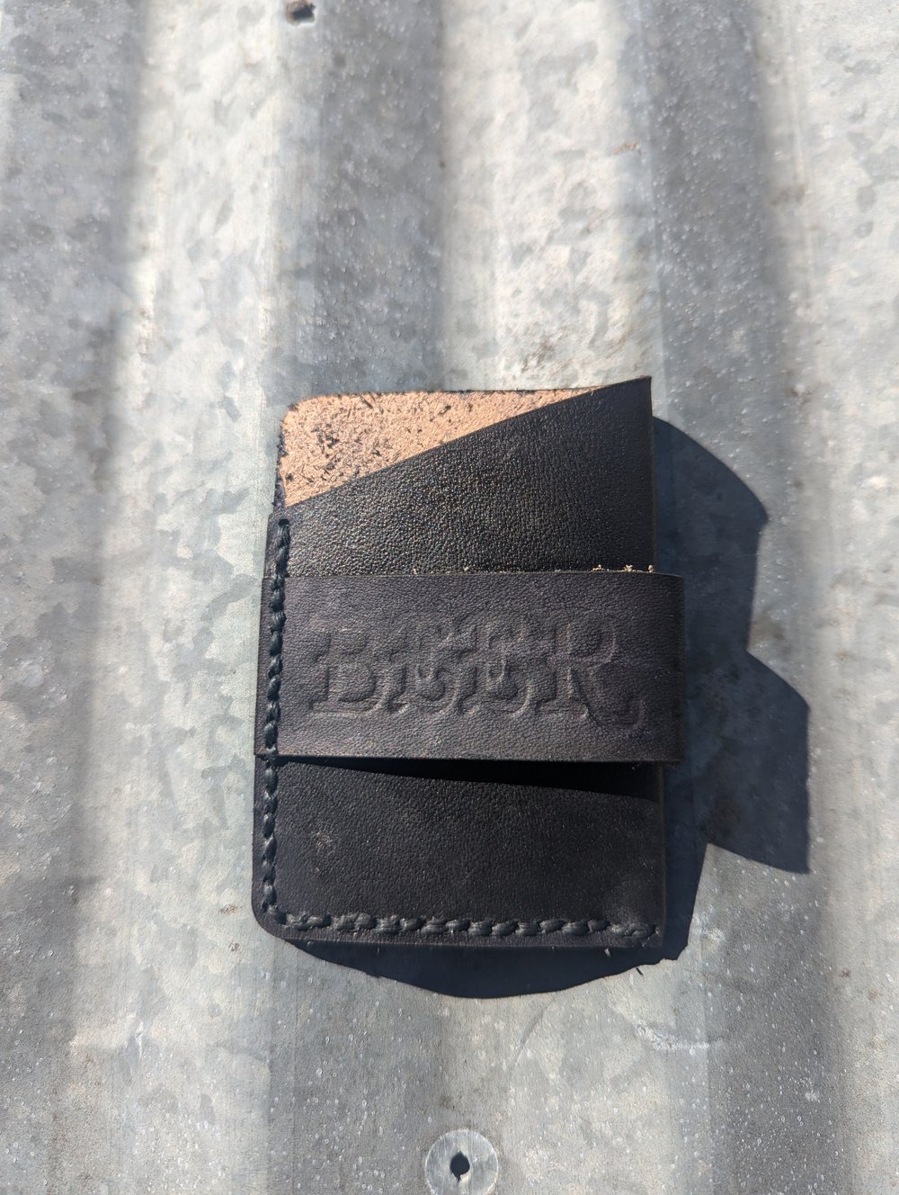 Hand made leather card slip with cash band, custom pattern, hand sewn,dyed and stamped.